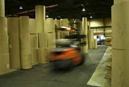段ボールの原紙は、ロール状に巻き取られた形態をしています。当社はお客様の多様なニーズにお答えするため、様々な寸法・種類の段ボール原紙を常時在庫しています。