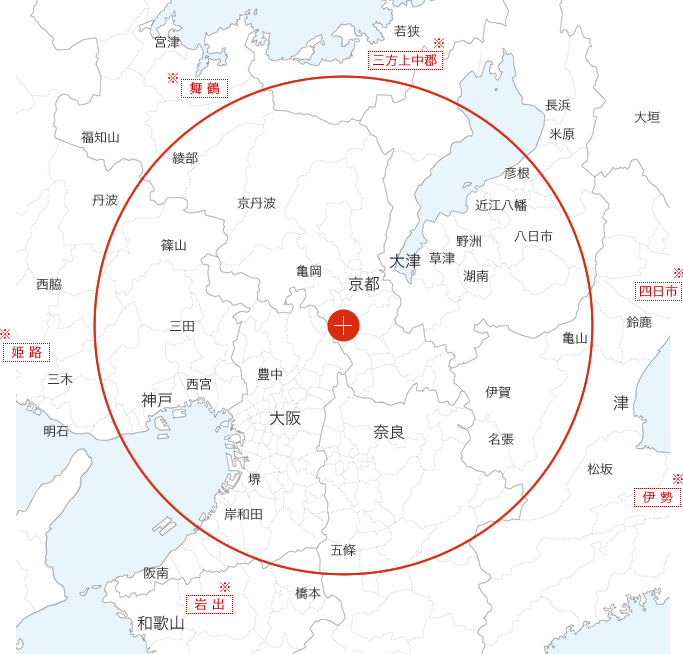 エリアは京都・大阪・滋賀・奈良の主要地域をカバー。時間指定もご相談に応じます。
